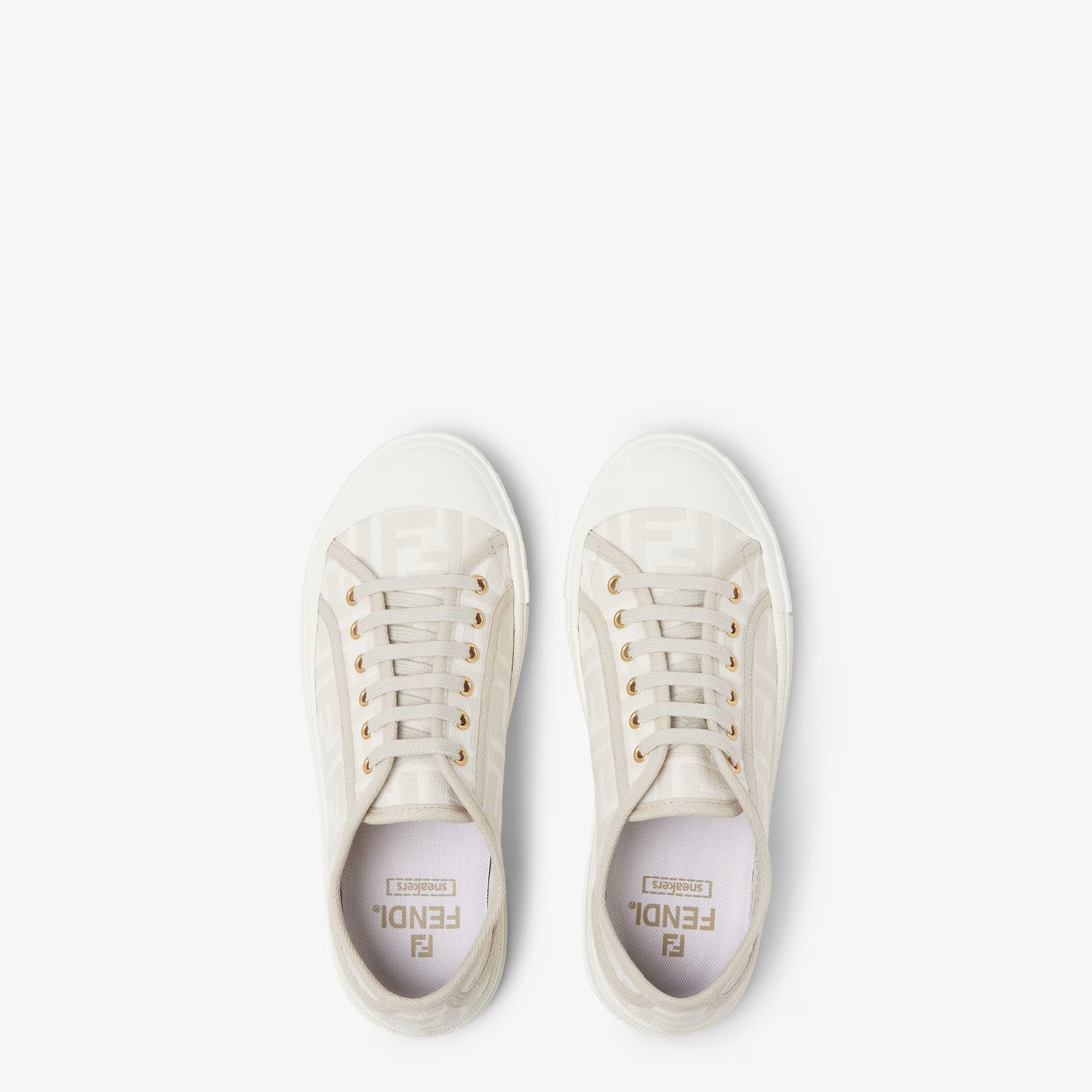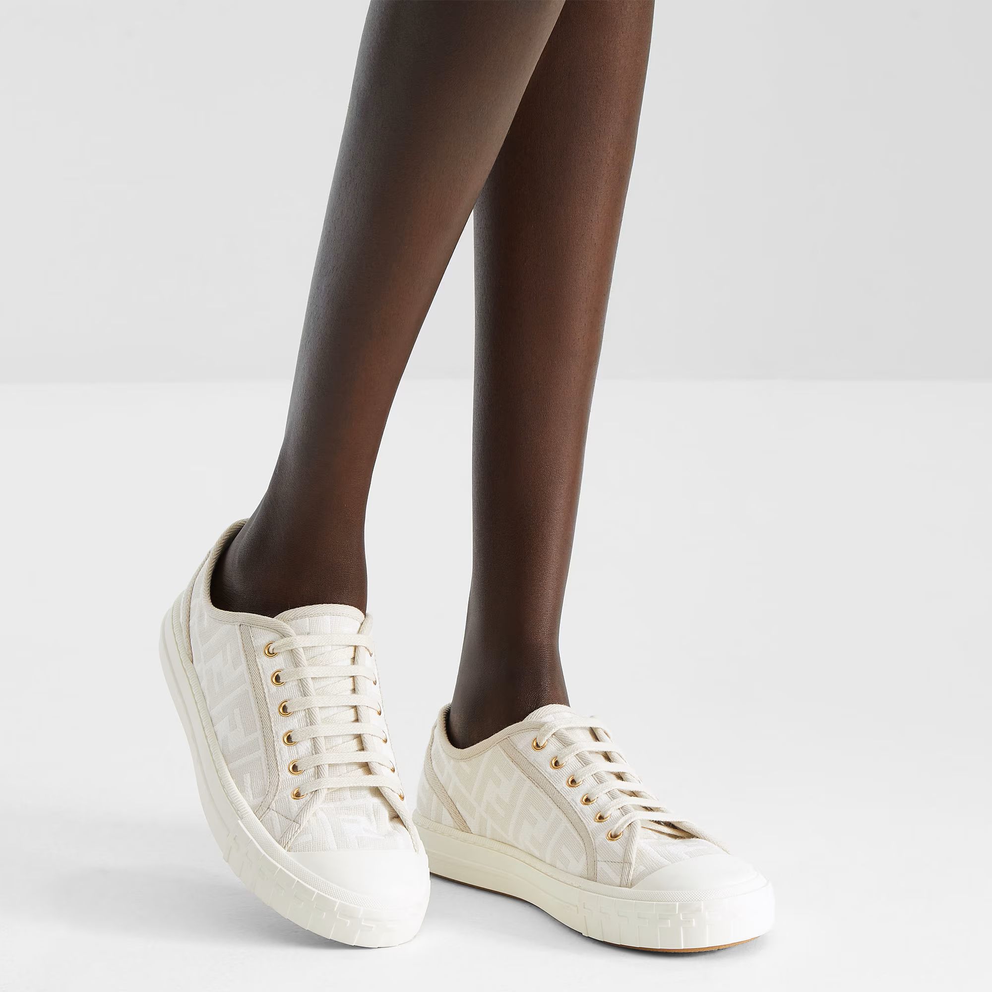 Tenisky Domino s gumovou podrážkou. Vyrobené z žakárové tkaniny s motivem FF v barvě slonové kosti. Lemované tón v tónu grogrénovou stuhou. Bílá podrážka s kontrastním spodkem se vyznačuje kombinací reliéfních textur, vzorem FF na špičce a logem Fendi Roma na patě. Extra bílé tkaničky.