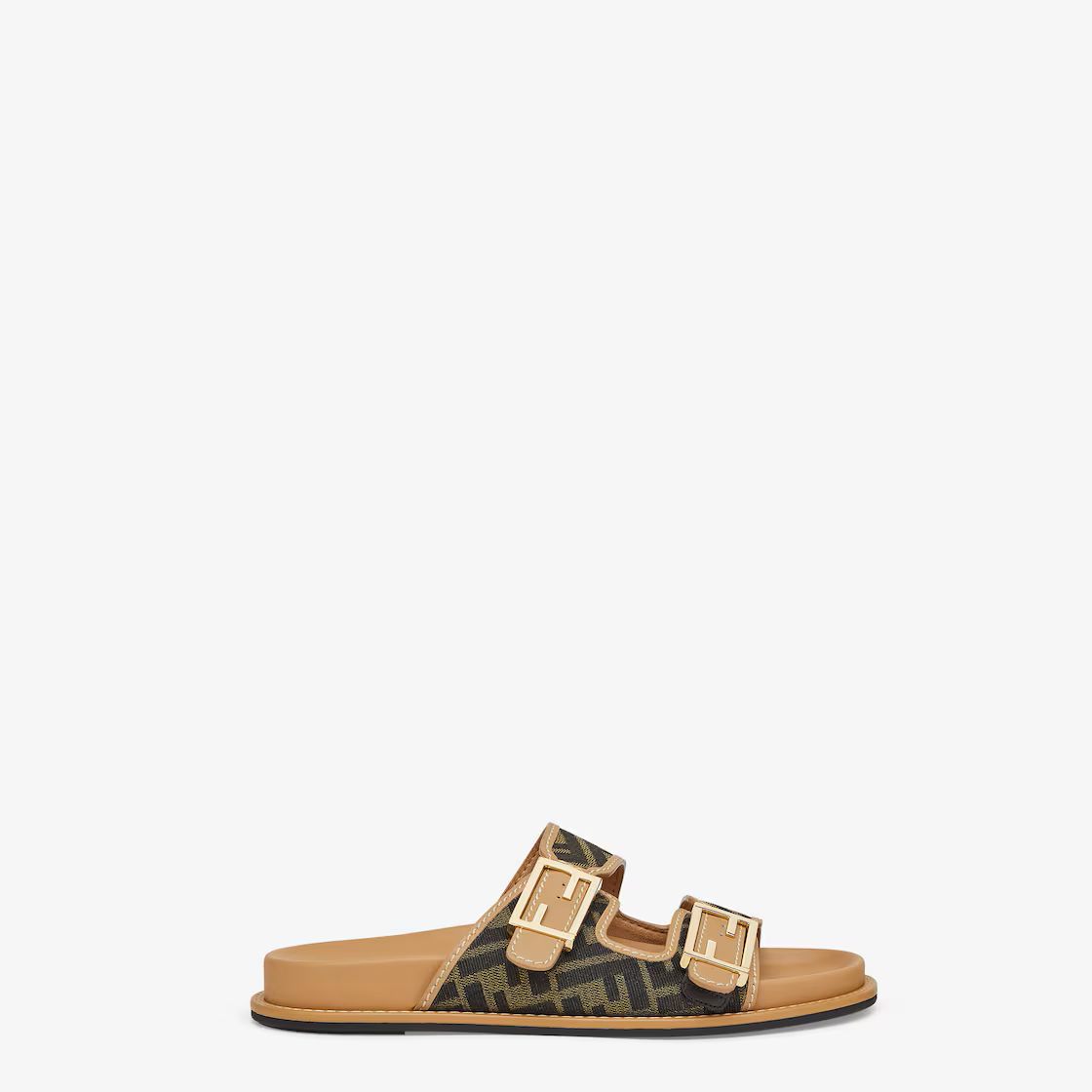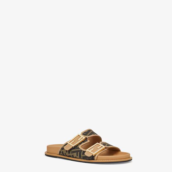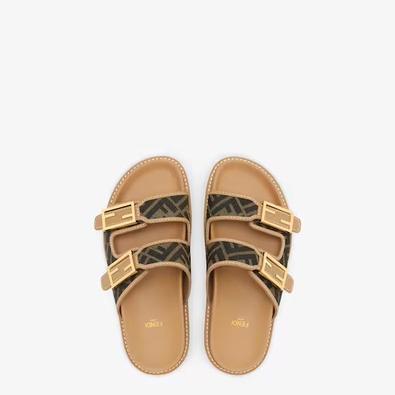 Ploché skluznice s dvojitým páskem a ozdobnými přezkami FF Baguette. Vyrobeno z žakárové tkaniny s motivem FF v hnědé barvě. Světle hnědé kožené okraje. Kování se zlatou povrchovou úpravou.