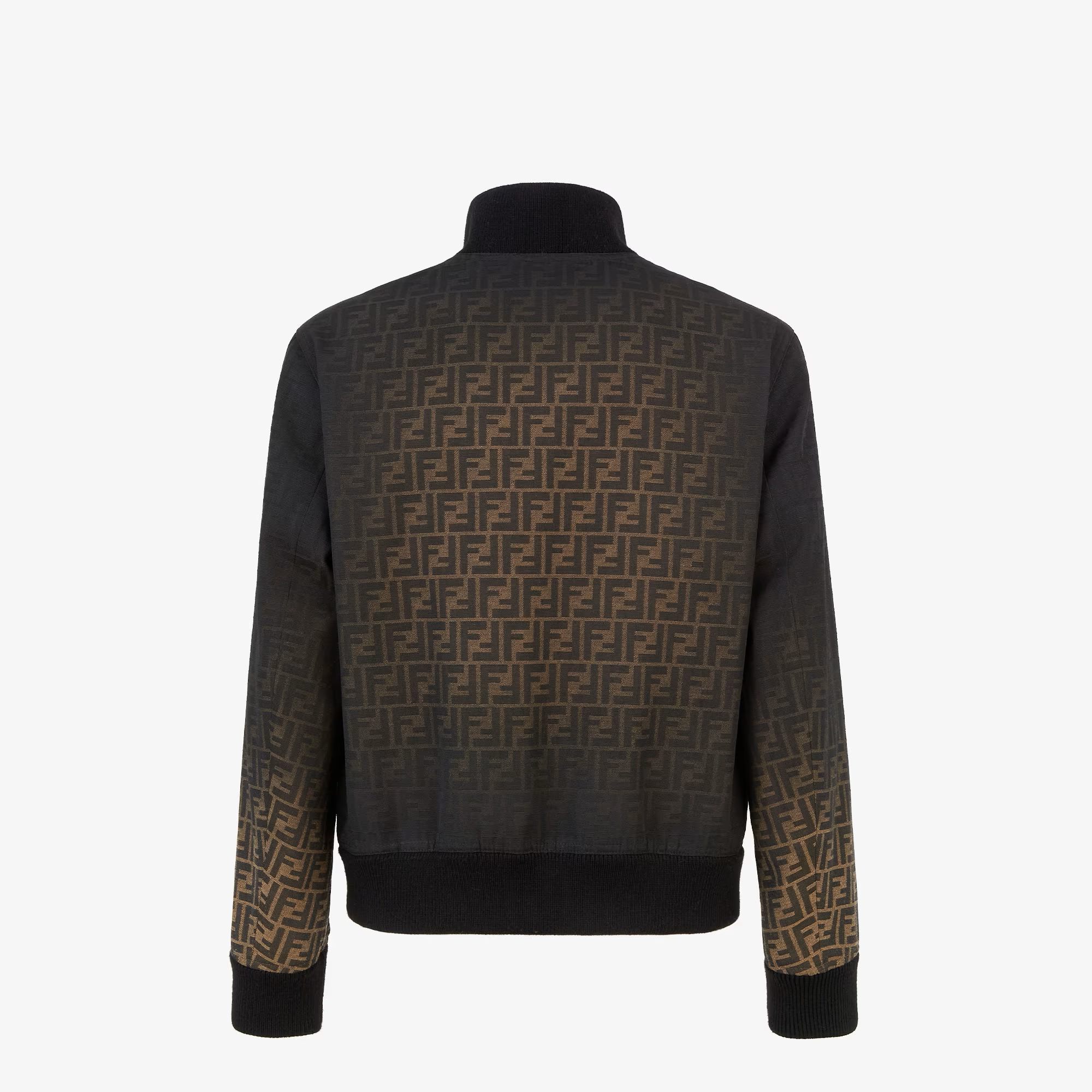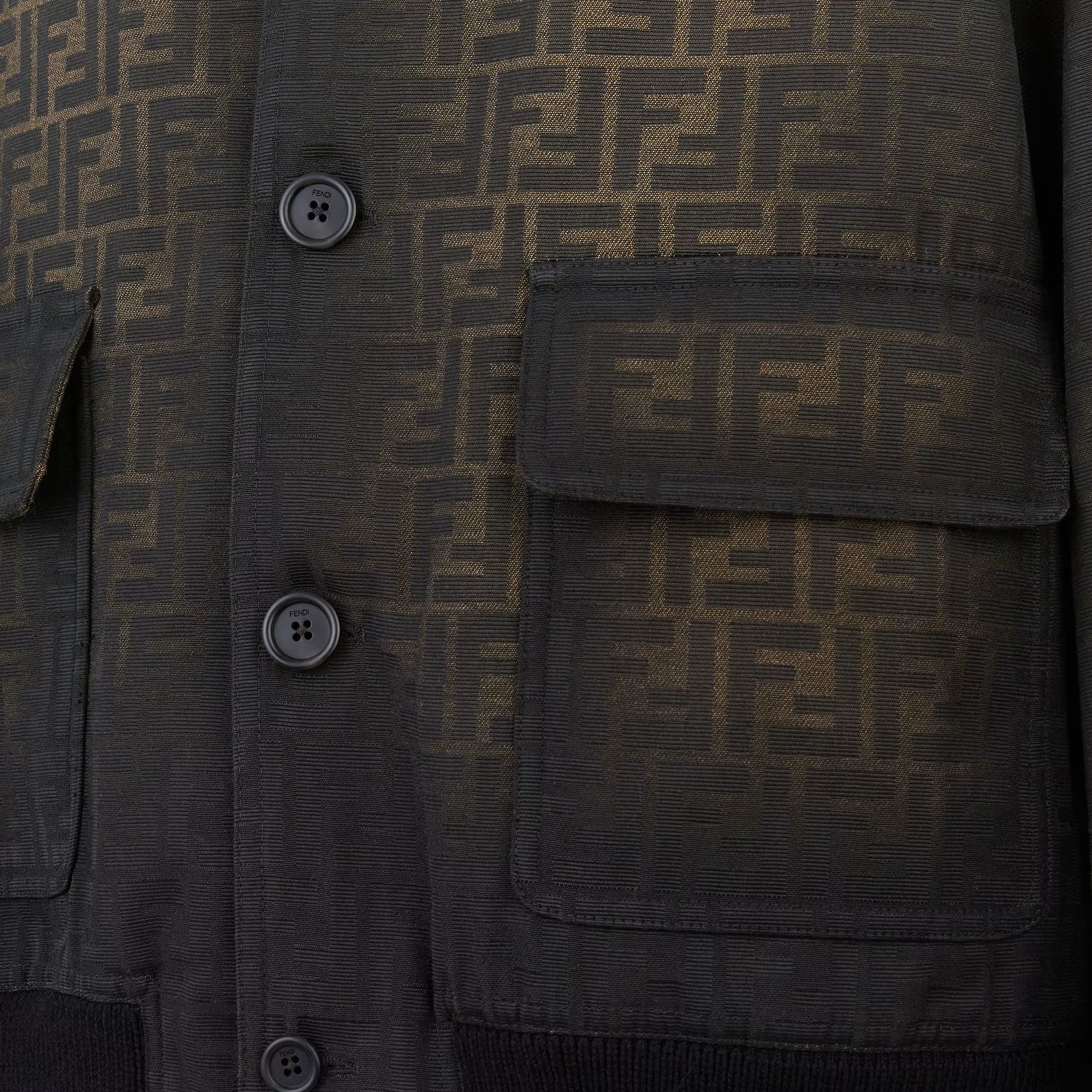 Bunda s vysokým límcem a kapsami s klopou na přední straně. Pletený límec, manžety a spodní lem. Mírně vyteplená, prošívaná podšívka. Shodné zapínání na knoflíky. Vyrobeno z tkaniny s žakárovým motivem FF Eclissi, na okrajích ručně stínované. Lemováno černým žebrovaným pleteným límcem, manžetami a spodním lemem. Vyrobeno v Itálii.