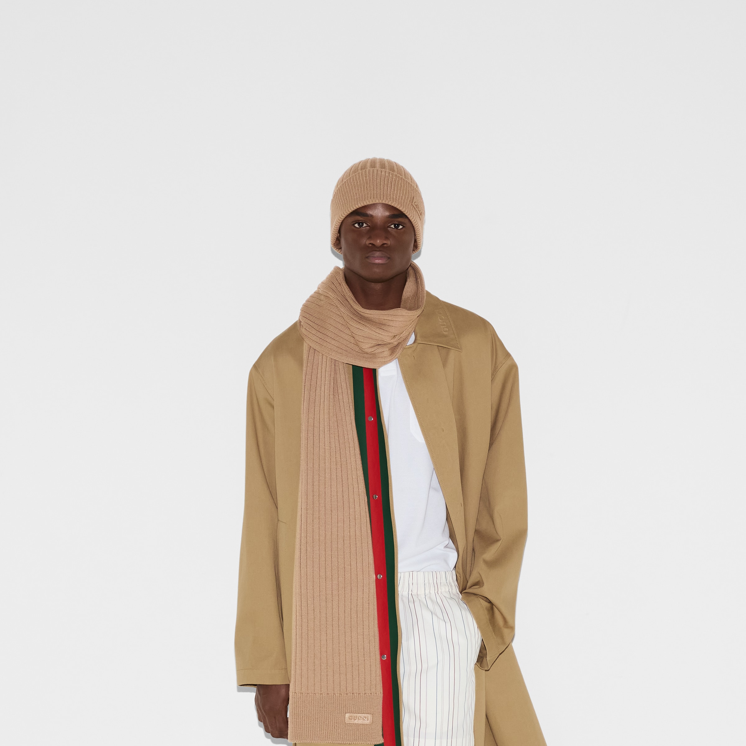 Logo Gucci, charakteristický symbol domu, je zobrazeno na vybraných hedvábných a jemných doplňcích v jemné barevné paletě. Tato čepice je vyrobena z béžové žebrované vlny a je opatřena tonální koženou visačkou Gucci.