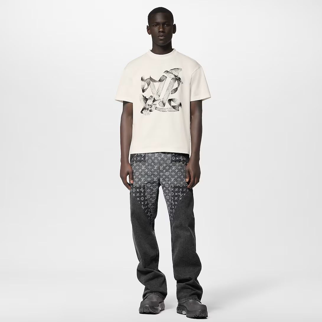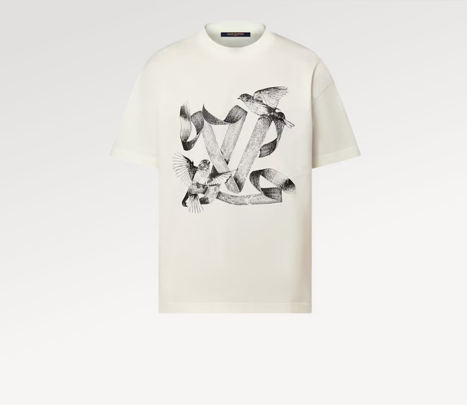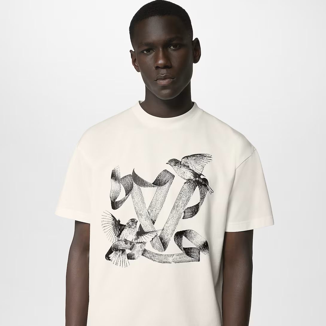Toto lehké bílé bavlněné tričko zdobí romantický sítotiskový motiv LV Birds z přehlídky FW23. Tento kousek s motivem buy-now-wear-now přináší grafický nádech do ležérních a nadčasových siluet.