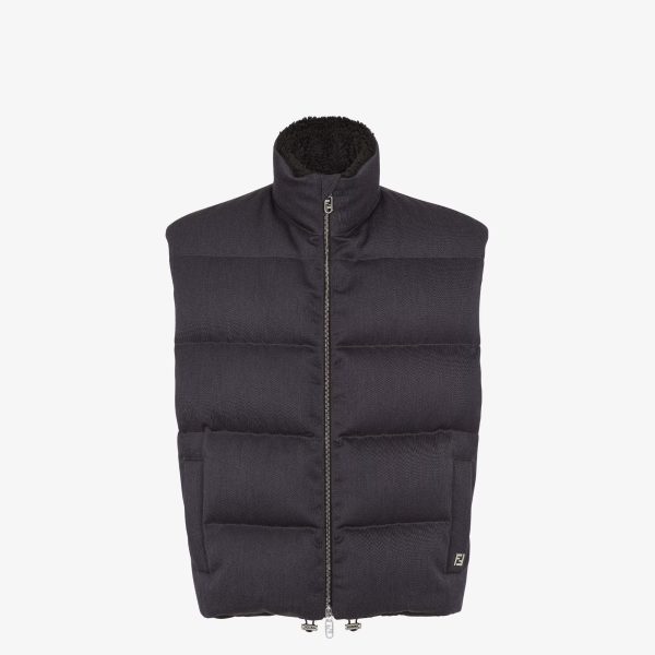 Vesta s vycpávkami, vysokým límcem a stahovacími šňůrkami. Na bocích jsou kapsy s lemem. Zapínání na zip s dvojitým jezdcem. Vyrobeno z černého vlněného kepru s vodorovným pruhovaným prošívaným motivem. Podšívka z žakáru FF ve stejném tónu a vnitřní límec z černé ovčí kůže. Zdobená kovovou aplikací loga FF na levé boční kapse. Kování s palladiovou povrchovou úpravou.